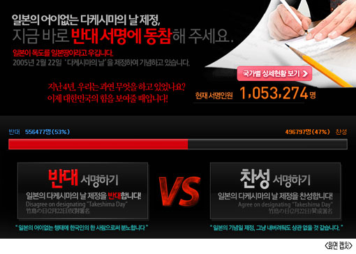 [쿠키 IT] 한 포털사이트가 진행하고 있는 일본의 ‘다케시마의 날’ 제정 반대 서명운동에 대한 네티즌들의 시선이 곱지 못하다. 곳곳에 서명운동의 순수성을 의심할 만한 요소들이 감지되고 있기 때문이다.