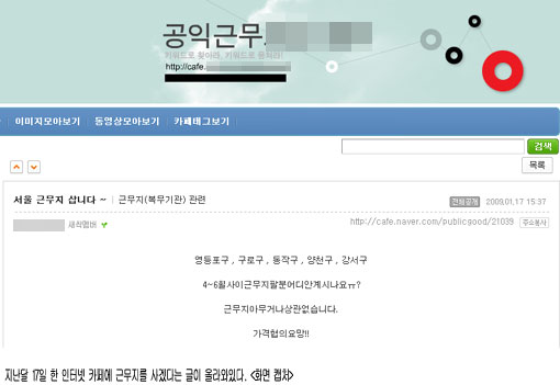 22일 각 인터넷 포털 사이트의 각종 게시판에는 공익근무요원 소집 예정자들이 돈을 지불하면 특정 근무지나 소집 날짜를 넘기겠다는 글이 적지 않게 올라와 있다.