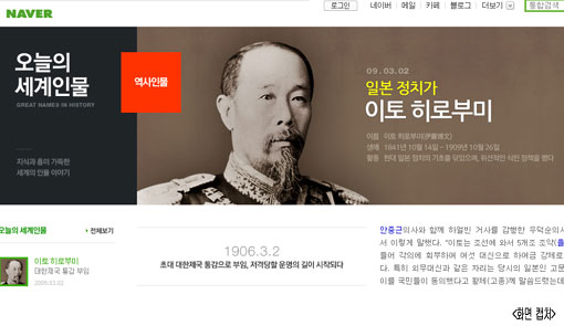 [쿠키 사회] 포털사이트 네이버가 ‘네이버캐스트’ 서비스를 통해 선정한 ‘오늘의 세계인물’에 대해 네티즌들의 뭇매를 맞고 있다. 3.1절 다음날인 2일 선정된 인물이 다름 아닌 한국 식민 정책의 중심에 서 있던 일본 정치가 ‘이토 히로부미’라는 것이 이유다. 네이버는 네티즌들의 비난이 거세지자 이날 오전 이 서비스에서 이토 히로부미를 급히 삭제했다.