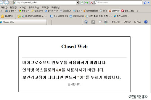 김 교수는 항소 기각 직후 오픈웹 사이트를 닫아버리고 화면에는 ‘클로즈드웹(Closed Web)’이라는 제목을 달았다. 이어 “마이크로소프트 윈도우를 사용하시기 바랍니다. 인터넷 익스플로러 6.0을 사용하시기 바랍니다. 보안경고창이 나타나면 반드시 ‘예’를 누르기 바랍니다”라며 비꼬았다.