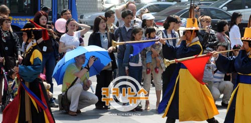 [쿠키 사회] 5일 오전 11시 서울 정동 덕수궁 앞. 왕궁수문장 교대식이 시작되자 외국인 관광객들이 금세 궁 앞을 빙 둘러섰다. 흐트러짐 없는 수문장들의 도열에 눈이 휘둥그래져 연방 카메라 셔터를 눌러댔다. 10분 남짓한 행사가 끝나자 수문장 옆에 가서 사진 찍기에 바쁘다.