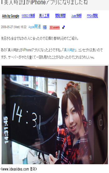 [쿠키 IT] 톡톡 튀는 아이디어로 전 세계 네티즌의 화제를 곧잘 모으는 일본에서 ‘미인시계(Bijin Tokei)’라는 웹서비스가 등장해 화제를 모으고 있다. 올해부터 시작된 이 서비스는 일종의 웹 애플리케이션 서비스. 이름 그대로 사용자의 컴퓨터에 미인이 나타나 시간을 알려주는 서비스다.