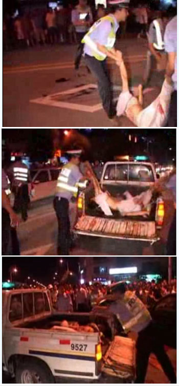 중국의 각종 블로그 및 게시판 등을 통해 전해지면서 네티즌들의 공분을 사고 있는 이 사진은 교통사고 현장에 도착한 경찰이 쓰러져 있는 한 여성을 옮기는 모습이다. 사진 속 모습으로 봐서 이 여성은 숨진 것으로 추정된다.