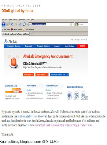 미국의 보안업체 선벨트 소프트웨어(Sunbelt Software)의 알렉스 엑켈베리(Alex Eckelberry) 연구원은 지난 10일 회사 블로그(sunbeltblog.blogspot.com)에 올린 ‘DDoS 세계적 광란(DDoS global hysteria)’이란 제목의 글에서 지속적으로 제기되고 있는 한국과 미국의 DDoS 대란의 북한 배후설에 대해 ‘헛소리(This is nuts)’라고 일축했다.