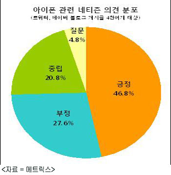 리서치 전문 기관 메트릭스는 지난달 28~30일 트위터와 네이버 블로그 내 4000여 개의 글을 분석해 아이폰과 관련된 네티즌 트렌드를 모니터링한 결과 성능·사용성(26.4%), 배송(13.2%), 애플리케이션(10.4%), 기대/전망(10.4%), 구매(7%) 관련 글들이 많이 게재됐다고 2일 밝혔다.