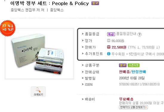 이명박 정부 세트는 2008년 3월 정가 9만6000원에 중앙북스에서 발간됐다가 이번에 77%(7만3500원)가 할인된 2만2500원에 중고책으로 출시됐다. 배송비는 따로 내지 않는 무료배송 상품이며 여기에 인터파크 우수회원의 경우 추가 포인트 적립을 받을 수 있어 실제 판매가는 더욱 낮다.