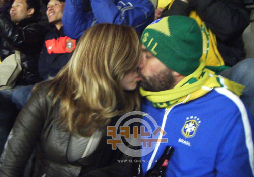 [쿠키 스포츠] 15일(현지시간) 남아공 요하네스버그 엘리스파크 스타디움에서 열린 북한과 브라질의 2010년 남아공월드컵 조별리그 G조 1차전에서 남녀 브라질 관중이 입맞추고 있다. 요하네스버그(남아공)=국민일보 쿠키뉴스 김철오 기자 kcopd@kmib.co.kr