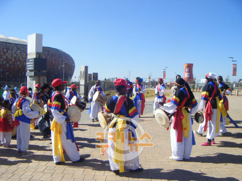 [쿠키 스포츠] 17일(현지시간) 남아공 요하네스버그 사커시티 스타디움 앞에서 현지인으로만 구성된 풍물패가 한국 축구대표팀의 선전을 기원는 풍악을 울리고 있다. 이들은 한국어로 “한국 이겨라, 대~한민국!”을 외쳤다. 한국대표팀은 이날 아르헨티나와 2010년 남아공월드컵 조별리그 B조 2차전을 벌인다. 요하네스버그(남아공)=국민일보 쿠키뉴스 김철오 기자 kcopd@kmib.co.kr
