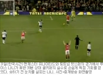 [쿠키 스포츠] 박지성(29)이 올 시즌 첫 풀타임 활약한 맨체스터 유나이티드(이하 맨유)와 토트넘 핫스퍼 경기에서 황당한 득점 장면이 연출됐다. 코미디만큼 폭소를 자아냈던 이번 득점의 주인공은 맨유의 미드필더 루이스 나니(24)다.