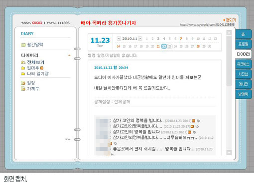 서 병장의 미니홈피엔 “배야 꼭 떠라, 휴가 좀 나가자”라는 제목이 적혀있다. 기상악화 등의 이유로 휴가여도 육지로 나오지 못하는, 외딴 섬에 근무하는 군인들의 애환이 그대로 드러난 대목이다.