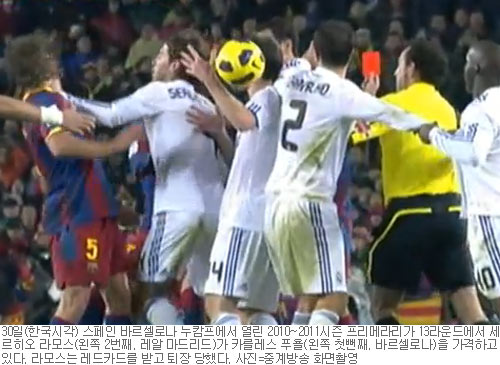 이때 레알 마드리드 수비수 세르히오 라모스는 바르셀로나 수비수 카를레스 푸욜의 얼굴을 손으로 가격해 넘어뜨렸다. 푸욜이 넘어져 뒤로 한 바퀴 구를 정도로 단순 폭력이 아니었다. 라모스는 레드카드를 받고 그라운드 밖으로 나가는 과정에서도 사비를 미는 등 격한 감정을 추스르지 못했다.