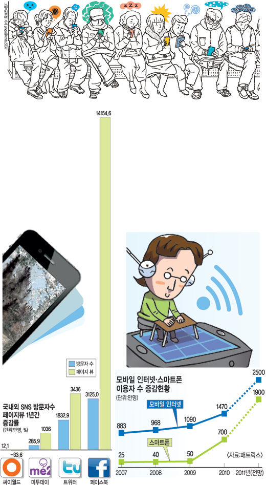 스마트시대의 광활한 ‘바다’에는 트위터 페이스북 등 소셜미디어라는 고속함정이 쉴 새 없이 항해 중이다. 스마트폰은 컴퓨터 앞에 앉아서만 이용하던 소셜미디어를 언제 어디서든 손 안에서 가능할 수 있도록 옮겨놨고, 이는 전광석화와 같은 정보의 유통 환경을 조성했다.
