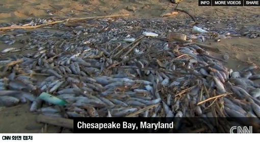로이터통신은 6일(현지시간) 미국 메릴랜드 주 체사피크 만에서 물고기 약 200만 마리가 떼죽음을 당한 채 발견됐다고 전했다.