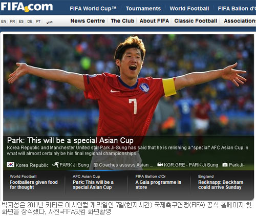 [쿠키 스포츠] ‘캡틴’ 박지성(30·맨체스터 유나이티드)이 2011년 카타르 아시안컵 개막일인 7일(현지시간) 국제축구연맹(FIFA) 공식 홈페이지 첫 화면(사진)을 장식했다. 51년 만에 노리는 한국의 우승을 자신하며 ‘나에게 특별한 대회’라는 말로 이번 아시안컵을 소개했다.