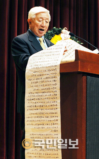 1일 서울 신문로 서울역사박물관에서 개최된 ‘대한독립선언 선포 제92주년 기념식’에서 조만제 삼균학회이사장이 독립선언서를 낭독하고 있다.