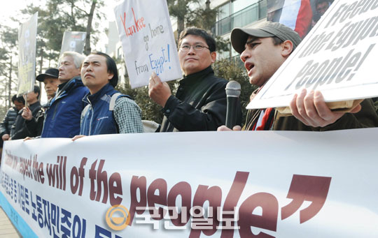 민주노총 관계자들과 이집트 이주노동자들이 8일 서울 한남동 주한이집트대사관 앞에서 ‘이집트 노동자-민중봉기 지지를 위한 국제공동행동의날’ 기자회견을 진행하고 있다.