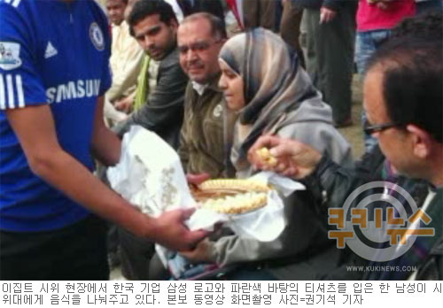[쿠키 지구촌] 9일 낮 12시(현지시간)쯤 이집트 카이로 타흐리르 광장에서 잉글랜드 프리미어리그 첼시FC 유니폼을 입은 현지 남성이 시위대에게 음식을 나눠주고 있다. 첼시 유니폼에는 국내 기업 삼성 로고가 새겨져 있어 눈길을 끌었다. 동영상(카이로)=국민일보 쿠키뉴스 권기석 기자