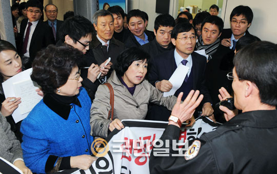 흡연이 폐암의 직접적인 원인인지 여부를 두고 12년을 끌어온 ‘담배 소송’의 항소심에서 법원이 원고패소 판결을 내린 가운데 15일 서울고등법원에서 원고측 관계자들이 법원 로비에서 사법부의 각성을 촉구하는 현수막을 펼치려 하자 법원 관계자가 이를 제지하고 있다.