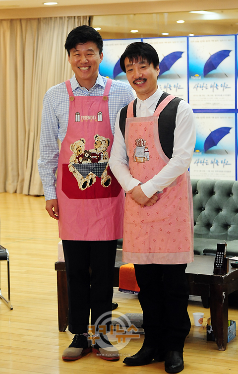 [쿠키 포토] 배우 홍록기, 임춘길이 17일 오후 서울 흥인동 충무아트홀에서 열린 뮤지컬 ''사랑은 비를 타고'' 연습 현장공개에 참석해 포토타임을 갖고 있다.