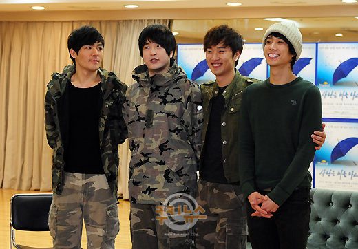 [쿠키 포토] 배우 최성원, 김태한, 최수형, 보령이 17일 오후 서울 흥인동 충무아트홀에서 열린 뮤지컬 ‘사랑은 비를 타고’ 연습 현장공개에 참석해 포토타임을 갖고 있다.