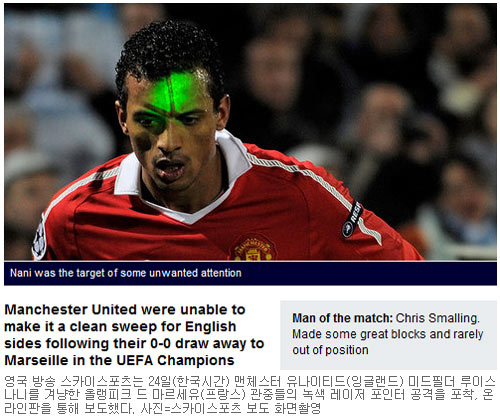 잉글랜드 프리미어리그 주관방송사 스카이스포츠도 마르세유 관중이 나니의 눈을 조준했다 살짝 빗나간 듯 이마에 찍힌 녹색 레이저(사진)를 포착, 온라인판을 통해 보도했다. 다행히 빗나간 것으로 보이지만 제대로 겨냥했다면 시력까지 손상시킬 수 있었던 아찔한 순간이었다.