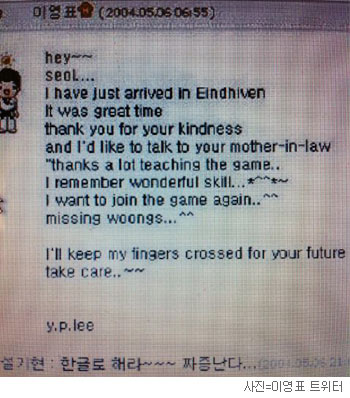 이영표는 지난 28일(이하 현지시간) 소셜 네트워크 서비스 ‘트위터(@fromtheline)’를 통해 “영어공부에 열을 올렸던 어느 날 (설)기현이의 집을 방문하고 돌아와 내가 아는 모든 알파벳을 동원해 글을 남겼다”며 2004년 5월6일 설기현의 미니홈피(사진)에서 벌어졌던 일화를 소개했다.