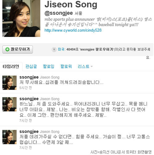 [쿠키 연예] 송지선(30) MBC 스포츠 플러스 아나운서가 트위터에 자살을 암시하는 듯한 글을 올려 새벽에 경찰과 119구조대가 출동하는 등 소란이 빚어졌다. 문제의 글은 해커 소행일 것이라는 당초의 예상과 다르게 송 아나운서가 직접 작성한 것으로 드러나 충격을 안겨주고 있다.