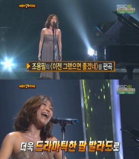 [쿠키 연예] 가수 박정현이 8일 방송된 MBC `우리들의 일밤-나는 가수다`(이하 나는 가수다)에서 조용필의 명곡 `이젠 그랬으면 좋겠네`를 완벽하게 소화하며 1위를 차지했다. 지난주 1위를 차지한 임재범은 4위를 기록했다.
