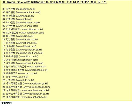 잉카인터넷에 따르면 이 파일은 실행 프로그램이 전부 한글화돼 있다. 여기에 더욱 놀라운 것은 파일 내에 국민은행, 우리은행 등 국내 27개 주요 금융기관의 리스트를 포함해 감염된 사용자가 금융기관 사이트에 접속하면 자동으로 감지되는 기능이 있다는 점이다.