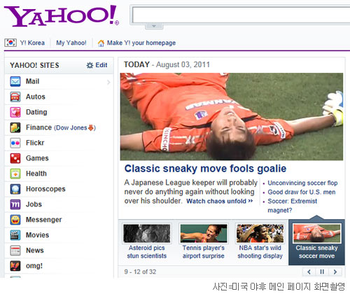 ‘미국 야후’의 경우 유튜브에 소개된 이 장면을 3일 첫 화면 머리기사(사진)로 내걸었다. 최근 조광래 대표팀 감독의 호출을 받았지만 정성룡(26·수원)과 김영광(28·울산)에게 밀려 빛을 보지 못했던 김진현도 이날 만큼은 세계적인 유명세를 탈 수 있었다.