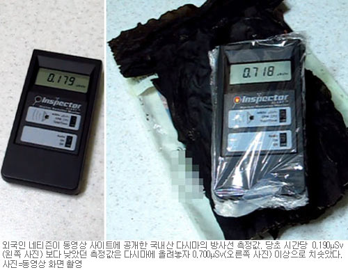 국내 체류 중인 외국인 네티즌(jo****)은 지난 2일 해외 유명 동영상 사이트 ‘비메오(www.vimeo.com)’를 통해 “강원도 춘천에서 쇼핑 중 구입한 다시마를 집으로 가져와 측정한 결과 다량의 방사선량이 검출됐다”고 주장했다. 그는 미국 H사의 고급형 방사선 측정기를 활용, 국내 업체에서 생산한 다시마의 방사선량을 직접 측정해 동영상으로 공개했다.