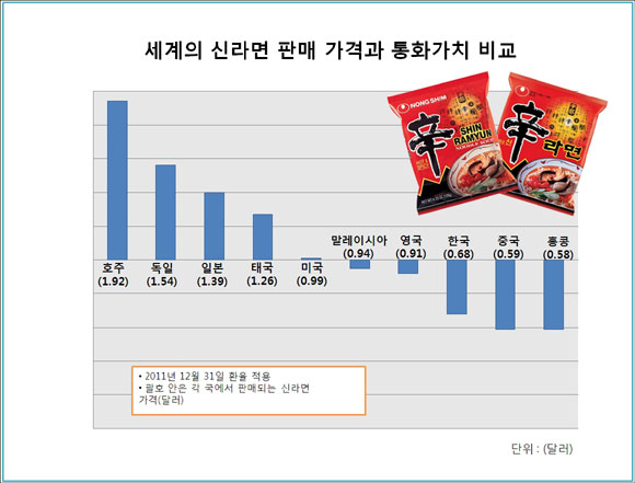 [쿠키 건강] 신라면 미국 현지 판매가격이 0.99달러(약 1,142)원인데 비해 호주가 1.89 호주달러(약 2210원)로 가장 비쌌고, 홍콩이 4.5 홍콩달러(약 668원)으로 가장 싼 것으로 조사됐다. 한국은 조사대상 10개 지역 가운데 8번째로 0.68달러(780원)였다. 특히 미국의 구매력을 1로 봤을 때 호주의 구매력이 1.94로 나타나 호주의 높은 물가수준이 신라면 지수에도 반영되고 있는 것으로 분석됐다. 이는 21일 농심이 발표한 신라면 지수에 따른 것이다.