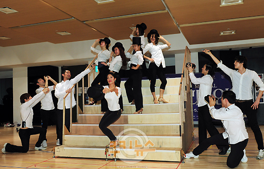 [쿠키 문화] 21일 오후 서울 신도림동 디큐브아트센터 연습실에서 뮤지컬 ‘파리의 연인’ 연습 현장이 공개됐다. 전 출연진이 취재진에게 포즈를 취하고 있다.