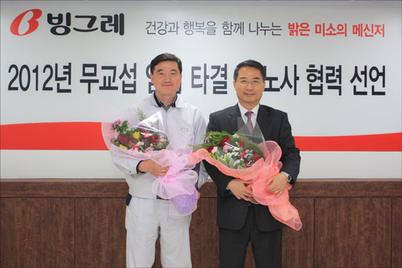 빙그레 노사는 5일 남양주시에 위치한 빙그레 도농공장에서 이건영 대표이사와 허성수 노조위원장 등이 참석한 가운데 2012년도 임금협상 무교섭 타결 조인식을 갖고 2012년도 목표달성을 위한 노사 협력 선언을 했다.
