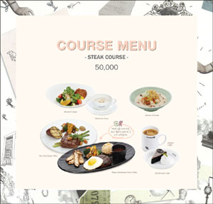 스테이크 코스(5만원)는 7가지 코스 요리로 마련됐다. 식전 빵과 신선한 샐러드, 양송이 스프의 에피타이저를 시작으로 메인 메뉴로 참숯으로 구운 스테이크와 수제 와규 버거 스테이크 중 하나를 선택할 수 있으며, 면 요리도 함께 제공된다. 후식으로 브라우니 케이크나 요거트 아이스크림을 커피 또는 차와 함께 즐길 수 있다.