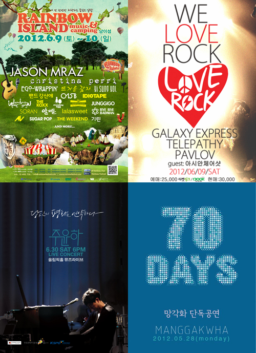 [쿠키 문화] 여름의 문턱 6월, 야외 활동이 활발해지는 만큼 본격적인 야외 뮤직 페스티벌도 시작된다. 5월 26~27일 양일간 서울 난지 한강공원에서는 국내 최다 팀이 참여하는 그린플러그드 페스티벌이 열리고, 6월 9~10일에는 남이섬에서 캠핑과 함께 즐기는 레인보우 아일랜드 2012가 열린다. 소극장 공연도 활발하다. 주윤하와 망각화는 각각 단독 공연을 개최하고, 러브락컴퍼니는 첫 레이블 쇼를 연다.
