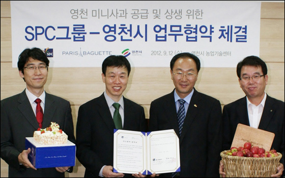 [쿠키 건강] 파리크라상의 대표 브랜드 파리바게뜨가 12일 영천시와 미니사과 공급 및 상생을 위한 업무협약(MOU)을 체결했다.