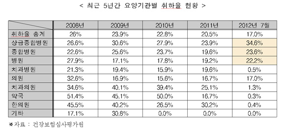 상급종합병원은 2009년 30.6%, 2010년 27.9%, 2011년 23.9%로 감소하는 추세였으나 금년에만 34.6%에 달해 신종플루가 휩쓸었던 2009년에 비해 현재 4%포인트나 더 높은 실정이다. 종합병원의 경우 ‘09년 25.6%, ’10년 23.7% ‘11년 19.6%로 감소하다 올해 23.6%로 치솟았고, 병원급 의료기관 역시 ’09년 17.1%, ‘10년 17.8%, ’11년 19.2%였다가 올해 22.2%로 증가하는 추세로 나타나 중·소규모 의료기관이 0%대로 급감한 것에 비하면 너무나도 대조적이다. 또 상급종합병원의 경우, 병원별로 들여다보면 더욱 심각한 상태임을 알 수 있다. 최근 3년간 취하율이 무려 50%에 육박하는 곳도 존재하며, 취하율이 작년 12%에서 올해 오히려 20.9%로 상승한 곳도 존재하였고, 올해 상급병원 평균 취하율을 웃도는 병원도 존재했다. 올해 7월까지의 자료임을 감안한다면 전년도 수치를 훨씬 상회할 것으로 보이는 곳도 다수 존재했다.