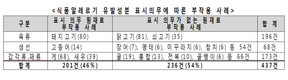 20일 한국소비자원이 2010~2011년 소비자위해감시시스템(CISS)에 접수된 식품알레르기 사례 1354건 중 원재료명이 확인된 437건을 분석한 결과, 표시의무 대상 13개 품목이 아닌 다른 원재료에 의한 알레르기 사고가 236건(54%)으로 절반 이상을 차지했다.