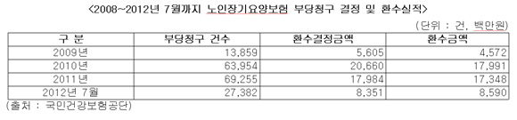 20일 국회 보건복지위원회 소속 김현숙(새누리당)이 보건복지부 국민건강보험으로부터 제출받은 노인장기요양보험 부당청구 결정 및 환수실적(2008년~2012년 7월)에 따르면 17만4450건의 노인장기요양보험 부당청구건이 적발됐다. 같은 기간 부당청구 결정금액은 526억원이고, 이 중 환수된 금액은 485억원(92.2%)이다.