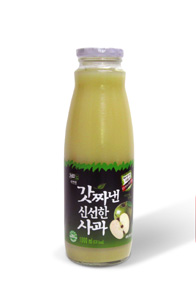 ‘갓 짜낸 신선한 사과’는 철저한 품질관리 하에 재배된 국산 저농약 인증 친환경 사과만을 사용해 사과 7개 분량(약 1430g)을 한 병에 그대로 담았다. 2012년 가장 먼저 출하되는 초록빛 사과인 아오리 사과를 그대로 착즙해 신선하고 새콤달콤한 사과의 진하고 풍부한 맛을 그대로 마실 수 있는 것이 특징이다. 국민일보 쿠키뉴스 조규봉 기자 ckb@kmib.co.kr