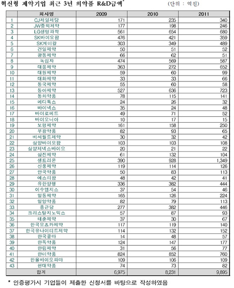 43개 제약사 중 의약품 R&D 투자금액이 가장 많은 업체는 셀트리온으로 2009년 390억원, 2010년 928억원, 2011년 1349억원 등 3년간 2,667억원을 투자한 것으로 집계됐다. 2위는 한미약품으로 2009년 824억원, 2010년 852억원에 이어 2011년에는 감소한 760억원 등 3년간 2436억원을 투자했으며, 3위는 LG생명과학으로 2009년561억원, 2010년 654억원, 2011년 680억원 등 3년간 1895억원을 투자했다. 4위는 동아제약으로 2009년 527억원, 2010년 636억원, 2011년 723억원 등 3년간 2886억원을 투자한 것으로 집계됐다. 이어 녹십자 1630억원, 대웅제약 1287억원, SK바이오팜 1256억원, 유한양행 1162억원, SK케미칼 1141억원, 종근당 1105억원 등 10개 기업이 3년간 1000억원 이상 투자한 것으로 조사됐다.