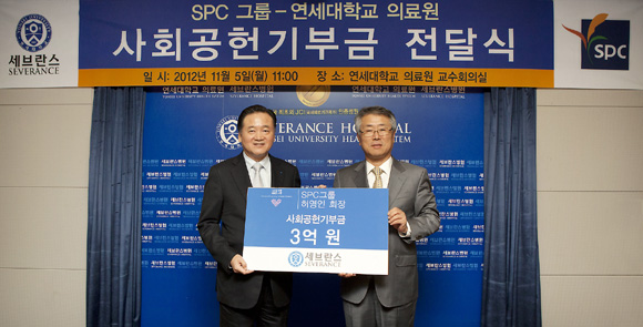 [쿠키 건강] SPC그룹이 5일 서울 신촌 세브란스 병원에서 연세대학교 의료원(원장 이철)과 사회공헌 기부금 전달식을 갖고 3억원을 전달했다.