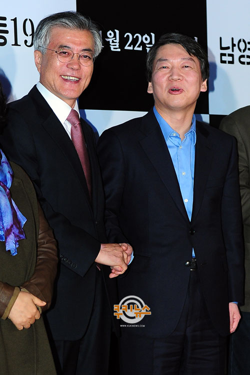 [쿠키 영화] 문재인 민주통합당 대선후보자, 안철수 무소속 대선 후보자(왼쪽부터)가 12일 오후 서울 삼성동 메가박스코엑스에서 열린 영화 ‘남영동 1985’ VIP시사회에 참석했다.