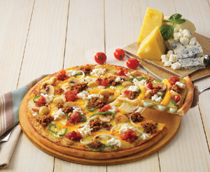 새롭게 선보이는 ‘콰트로치즈샌드 피자’의 ‘콰트로’(Quattro)는 이탈리아어로 숫자 4를 의미하며 크림블루치즈, 커티지생치즈, 에멘탈크림치즈, 모짜렐라치즈 등 4가지로 치즈의 풍미를 느낄 수 있는 제품이다.