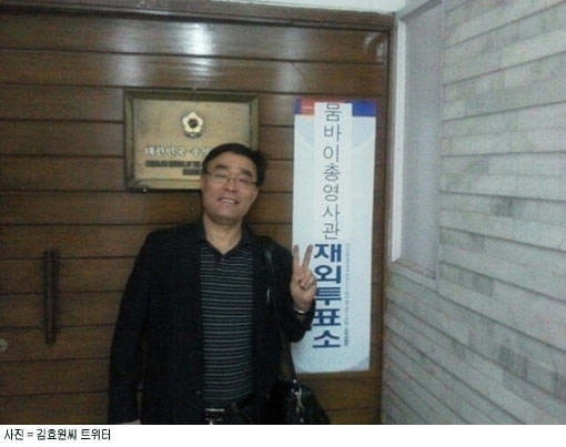 왕복 2000km를 달려 재외국민 투표에 참여해 화제가 되고 있는 김효원(사진) 씨가 17일 한 라디오 방송에 출연해 투표의 중요성을 역설했다. 인도 벵갈루루에서 무역업을 하고 있다는 그는 차 안에서 새우잠을 자 가며 40시간을 달려 기어코 한 표를 행사했다. 한반도의 세로 길이가 950km인 걸 감안하면, 한반도 2배 거리를 달려 투표한 셈이다.