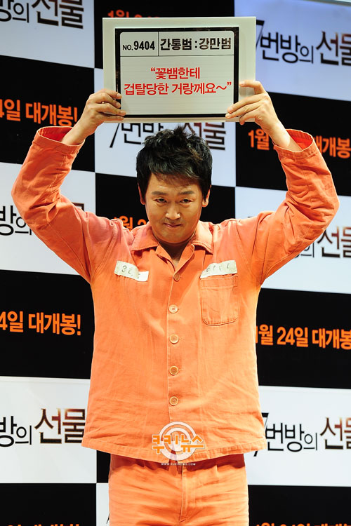 ‘7번방의 선물’은 각종 전과로 구속된 흉악범들이 가득한 교도소 7번방에 지능이 낮은 주인공 이용구가 입소하며 벌어지는 일을 그렸다. 배우 류승룡, 박신혜, 갈소원, 오달수, 박원상, 김정태, 정만식, 김기천 등이 출연한다. 오는 2013년 1월 개봉 예정.
