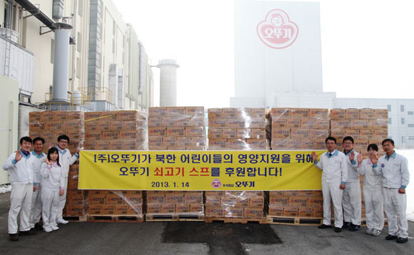 오뚜기는 지난해 12월 4일 북한 어린이 130만 명이 한 끼로 먹을 수 있는 오뚜기 쇠고기스프를 콘테이너 2대에 실어 보낸 데 이어, 올해 15일에도 평택항을 통해 쇠고기 스프 70만 명분을 보냈다. 지난 12월과 올해 1월에 오뚜기가 북한에 보낸 쇠고기스프의 양은 컨테이너 3대 분량으로 북한 어린이 200만명이 한 끼를 먹을 수 있는 양이다. 금액으로 환산하면 총 2억4000만 원어치다.