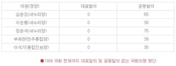 반면 새누리당 심윤조·이운룡·장윤석, 민주통합당 부좌현, 통합진보당 이석기 의원 등 5명은 한 건의 대표발의도 하지 않았다고 지적했다.