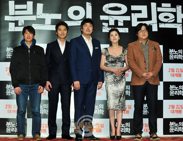 [쿠키 연예] 감독 박명랑, 배우 김태훈, 조진웅, 문소리. 곽도원(왼쪽부터)이 14일 오후 서울 자양동 롯데시네마 건대입구점에서 열린 영화 ‘분노의 윤리학’(감독 박명랑) 언론시사회에 참석했다.